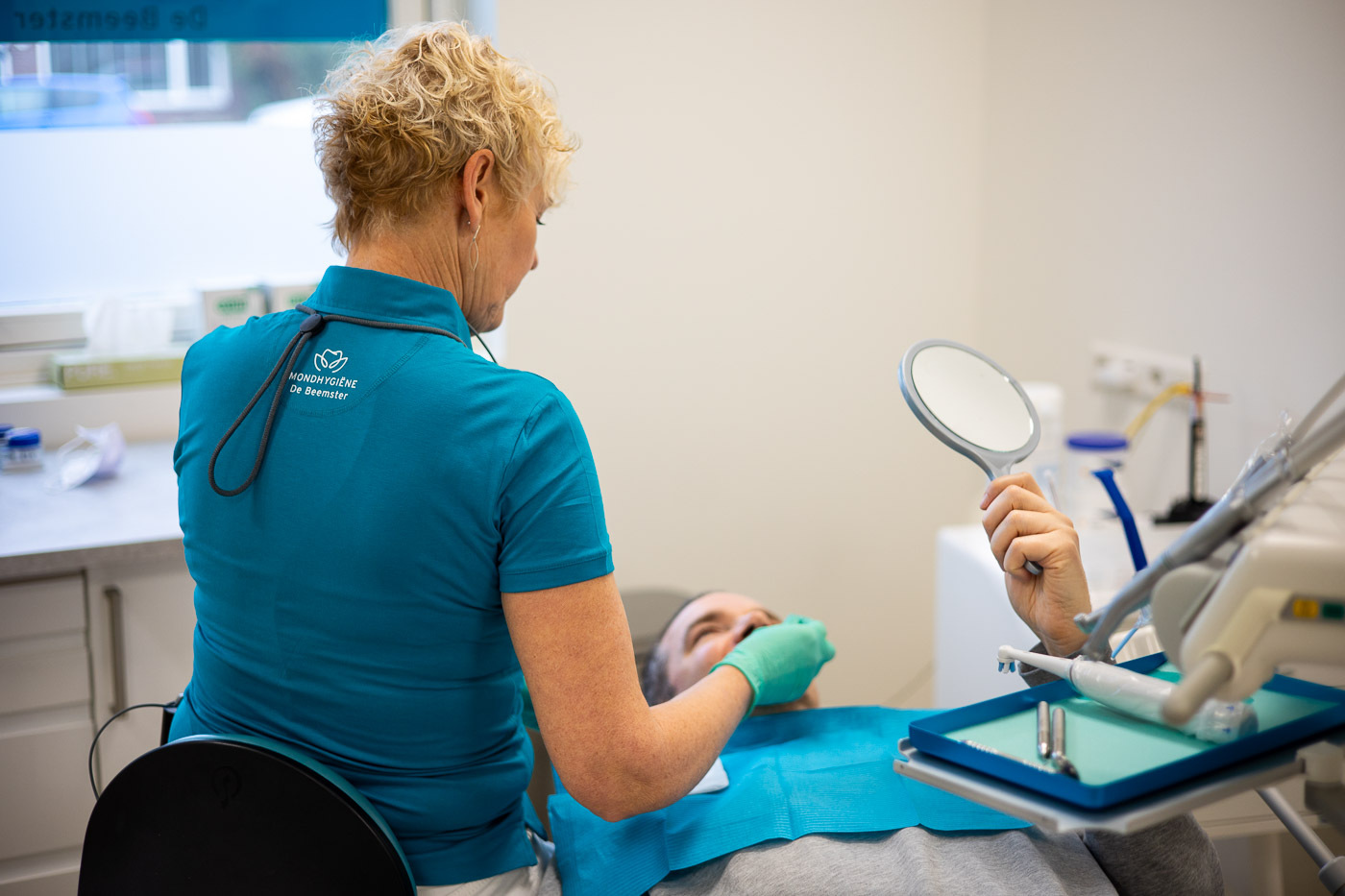 Tijdens een periodieke controle reinigen onze mondhygiënisten het gebied rond de implantaten zorgvuldig. Met speciale instrumenten verwijderen we tandplak en tandsteen en reinigen we het prothese gebit, zonder het titanium oppervlak te beschadigen. Zo blijft de aanhechting stevig en het tandvlees gezond.